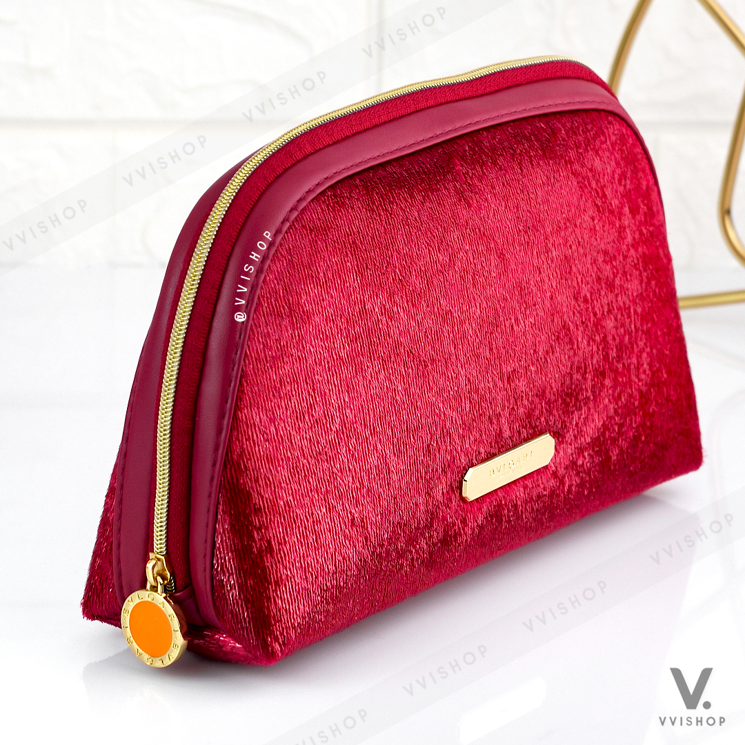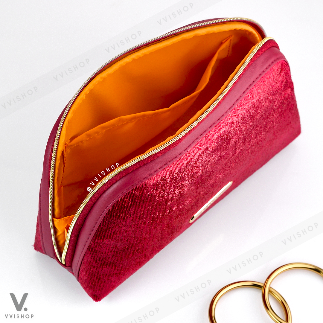 กระเป๋าเครื่องสำอางสีแดงเบอร์กันดี้ หรูหรามาก เล่นแสงวิบวับสวยงาม ทรงตั้งสวยเรียบๆแต่ดูหรู ตัดเย็บด้วยวัสดุคุณภาพดี แข็งแรงทนทาน ภายในบุซับด้วยผ้าสีส้มสดใส และมีช่องด้านข้างสามารถใส่อุปกรณ์ชิ้นเล็กๆ ได้ เป็นกระเป๋าที่ใส่ได้ทั้งเครื่องสำอางและของใช้ส่วนตัว ซิปสีทองรูดง่ายเรียบลื่น